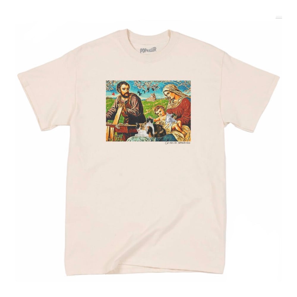 Collaboration with popkiller. They are a jesus family and cats all over the image. Also there Japanese katakana says Neko Chan means cute way to say kitty in Japanese